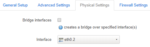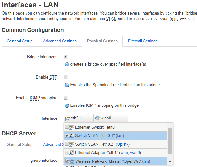 - Идем Network -> Interfaces. Выбираем интерфейс LAN (br-lan), нажимаем Edit. Переключаемся на закладку Physical Settings. Там в разделе Interface выбираем только eth0.1 и Wireless network: