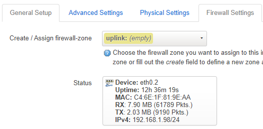 - На закладке Firewall settings нового интерфейса создаем новую firewall zone, назовем её uplink.