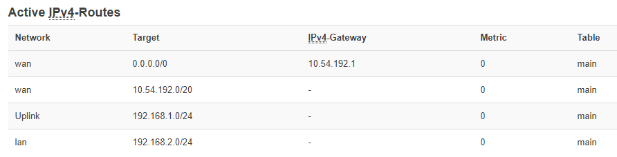 - Идем в Status -> Routes и проверяем Active IPv4-Routes. Мы должны увидеть, что сеть 192.168.2.0/24 идет через интерфейс lan, 192.168.1.0/24 через uplink, а 0.0.0.0/0 (то есть все другие адреса Интернет) через wan. Если мы дополнительно хотим машрутизировать доступ в интернет через первый роутер, то необходимо или настроить интерфейс uplink на динамический IP адрес — в этом случае первый роутер будет присваивать адрес интерфейсу uplink самостоятельно, а в OpenWrt динамический адрес приоритет, поэтому он будет пересылать весь трафик в первый роутер.