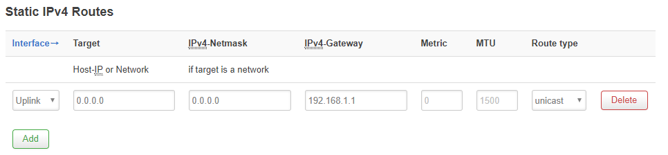 - Второй вариант — добавить статический маршрут на роутере OpenWrt для сети 0.0.0.0/0. Для этого идем в Network -> Static Routes создаем маршрут в сеть 0.0.0.0/0.