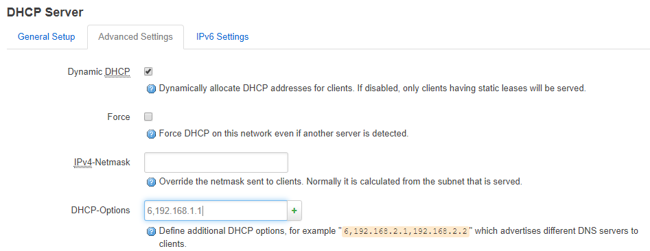 Альтернативный вариант — настроить использование DNS серверов домена в свойствах DHCP. Для этого в интерфейсе lan перейдите в Network -> Interfaces -> LAN -> Edit. В разделе DHCP server на закладке Advanced Settings в окне DHCP-Options укажите 6,192.168.1.1, где 6 — это 6-я опция, указывающая на альтернативные DNS сервера, а 192.168.1.1 — это DNS сервер в первой сети.