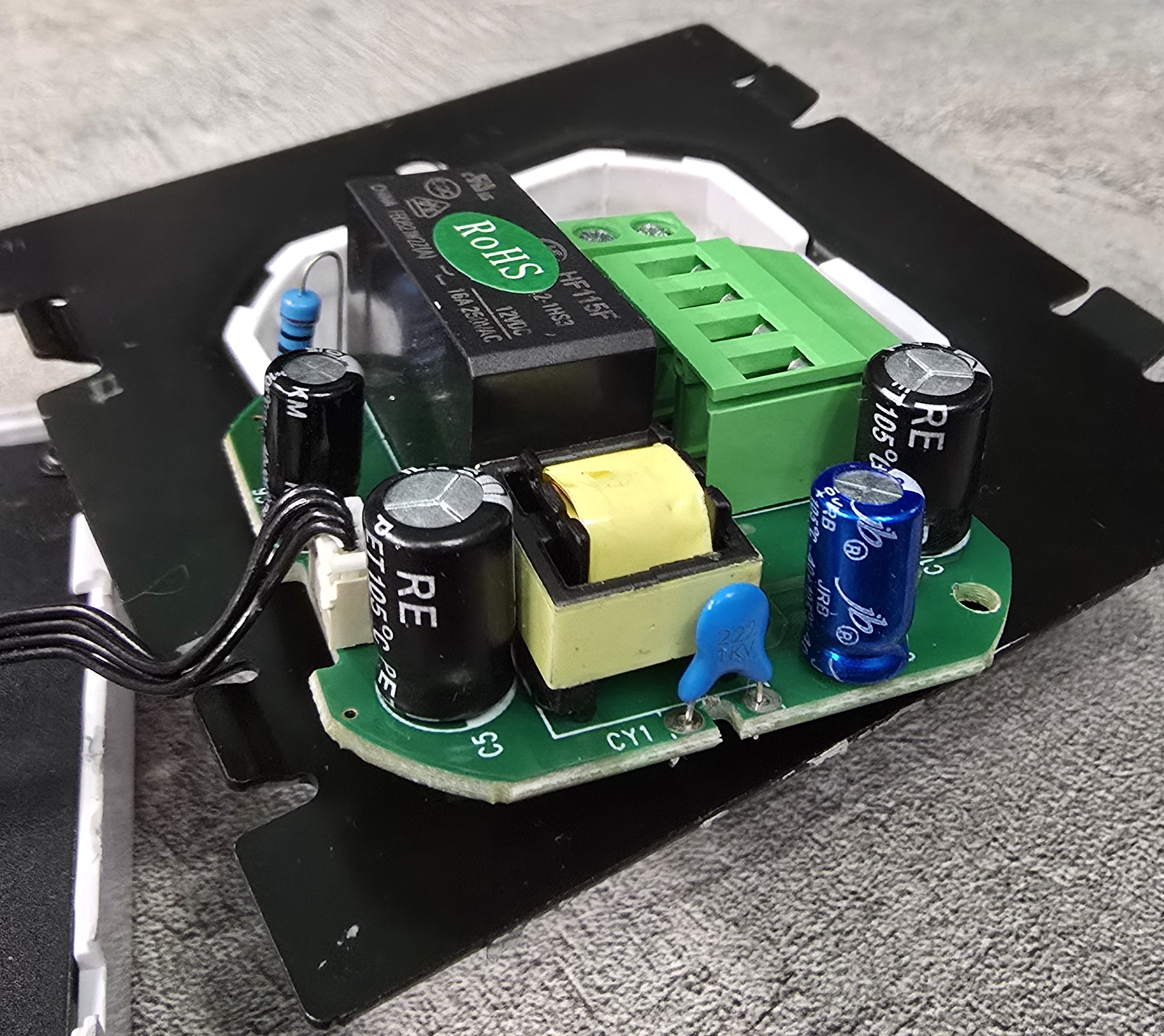 Блок питания формирует напряжения питания +5В на плату управления, а также подает ~220 В на ковер теплого пола с максимальным (регулируемым) током 16 А. Также в него подключается двухжильный провод от внешнего датчика NTC сопротивлением 10 кОм.