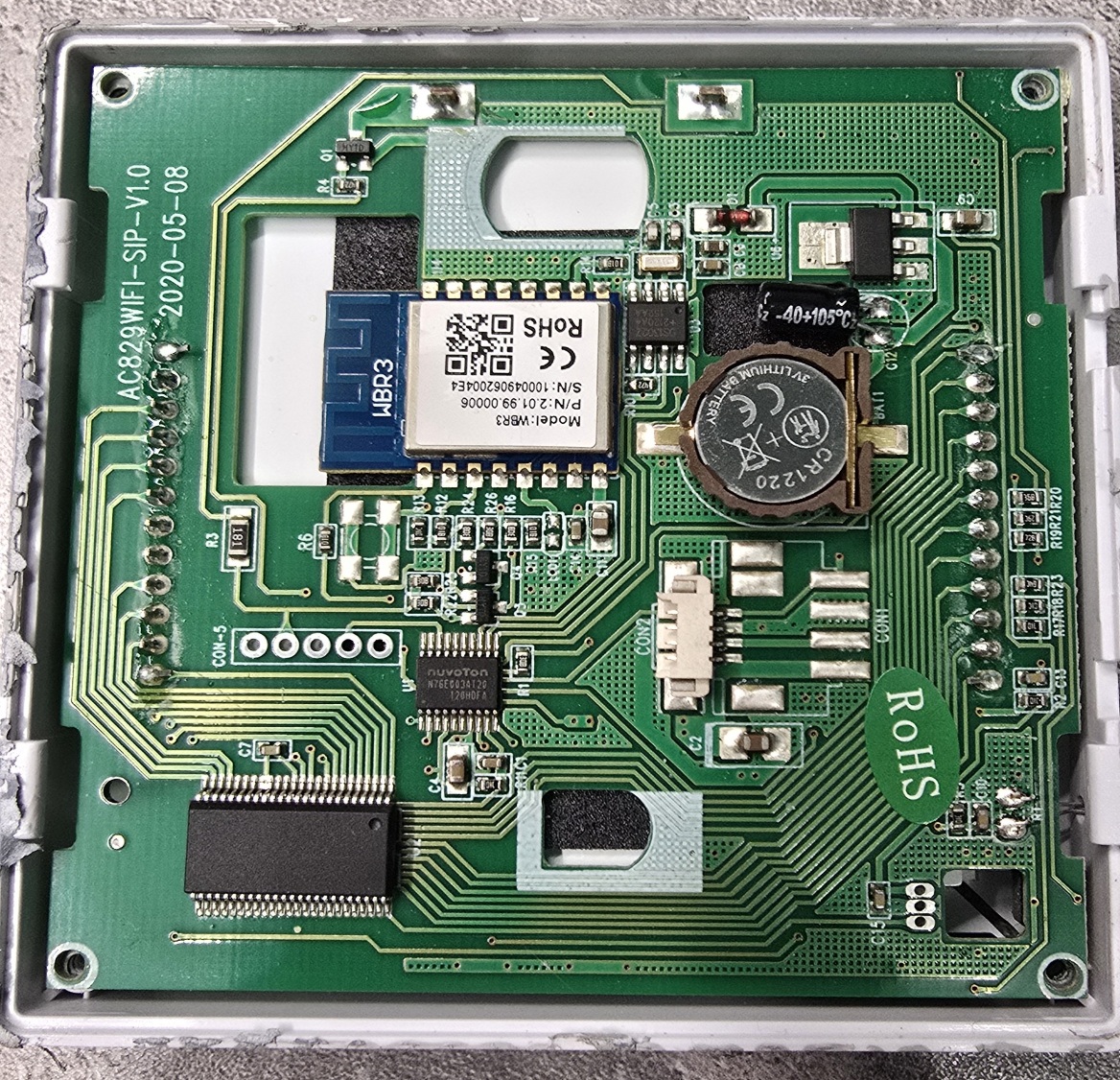 Для информации, разберем основные элементы платы управления. Плата маркирована как AC829WIFI-SIP-V1.0 и питается от +5 Вольт. Основа системы — Nuvoton N76E003AT20 — программируемый 8-бит микроконтроллер со встроенной 18кБ флэш-памятью хранит все настройки.