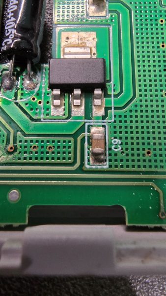 Последний пункт легко проверяется, сопротивление должно быть в районе 1 Ом. А самая вероятная причина — высохший электролит С3 (синий — замененный).