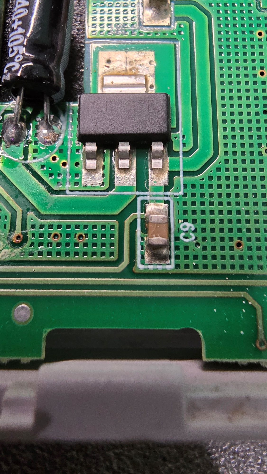 Из силовых элементов на плате используется линейный регулятор напряжения 3,3 В с током 1А: CJB1117B-3.3. Его типовая схема включения содержит один танталовый конденсатор 10 мкФ на входе и один на выходе емкость 22 мкФ.