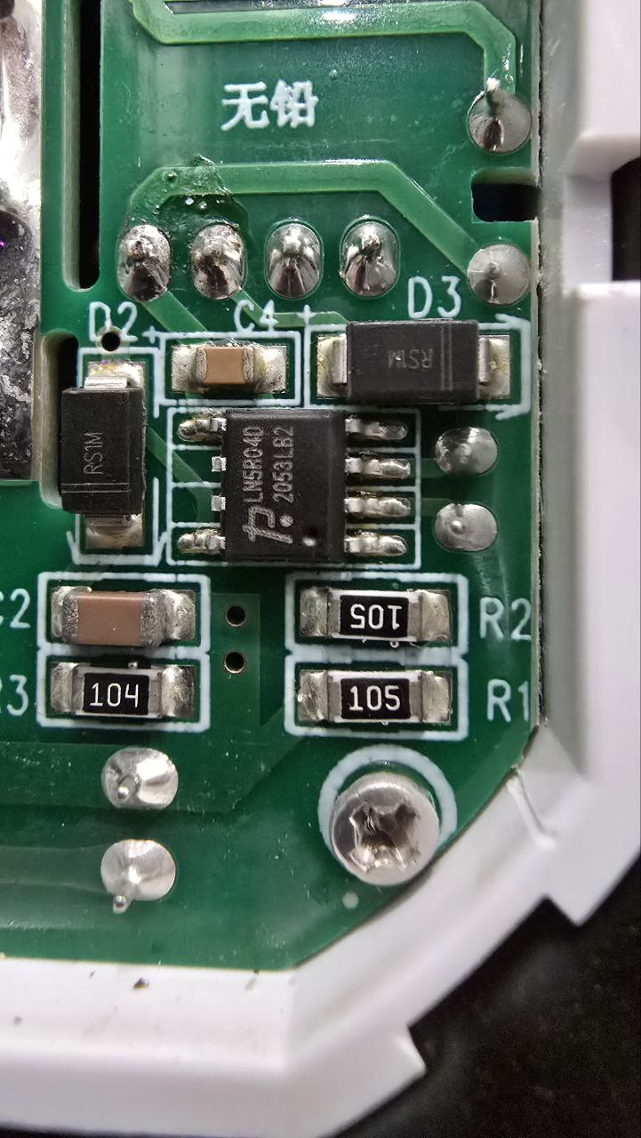 - Неисправна микросхема LN5R04D. Внутри микросхемы повреждена цепь питания Vcc — есть внутренняя утечка или короткое замыкание на землю. Например, мог сгореть встроенный стабилизатор напряжения. Микросхема «ест» весь стартовый ток (0.33 мА), и напряжение на Vcc не может подняться выше 4-6В.